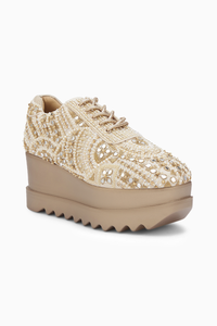 Our Sharara wedge sneakers are waiting for their next wedding invitation. Crafted in microsuede, each pair comes dressed up in beads, mirrors and sequins. They feature a hand-embroidered medley of cutdaana and dabka work. They’re designed to be your cheerleaders on big days packed with festivities, soaking in the joy with you and for you. The cushioned sole supports you for hours on end while also adding abundant sparkle to your ensemble.