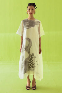 This lightweight, semi-sheer white dress features black and gray brushstroke prints in an airy, minimalist design. With a loose silhouette, short sleeves, and round neckline, it's perfect for effortless summer style.