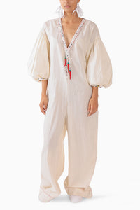 Featuring intricate braided detailing at the neckline, this Cream Cotton Seersucker Jumpsuit from the Chilli collection is adorned with handmade chilly tassels and finished with a bold chilly applique at the back, blending playful accents with everyday ease.