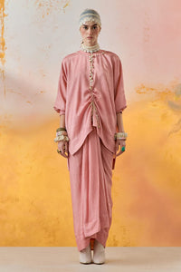 Featuring the Shell Pink Mural Kuru Trapeze Kurta with Skirt Set by Aseem Kapoor from the Mural Collection. This set includes a textured solid-colored short trapeze kurti with inserts and tribal tassel details, paired with a textured pleated skirt. Made from crushed silk, the kurti offers a free-size anti-fit, while the skirt features an elasticated waist for a relaxed fit. *Slight variation in print may occur.*