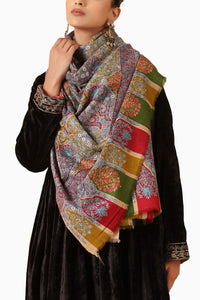 Turn heads with the Sherly Pashmina Shawl. This handwoven masterpiece features luxurious pashmina wool adorned with bold, intricate Kalamkari work. The oversized floral designs create a captivating statement piece steeped in cultural heritage.