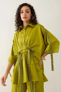 Sherry Shirt with a relaxed fit, this shirt combines a classic collar and button-front closure for a neat, structured look. The gathered fall from the yoke adds a soft, flowing element, while the tie-up at the center enhances the silhouette. Wide short sleeves offer a breezy feel, making it the perfect choice for laid-back vacation days.