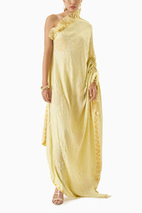 Tastefully crafted in rich and luxurious modal satin, this outfit drapes elegantly and is accented with lustrous flow, one shoulder, side gathers at hemline and frill details giving it a chic vibe. Sweep hair into a low chignon and style with metallic mules.