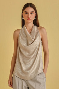 Featuring the Shimmer Cowl Neck Top by 29 India's Sunehri collection. Crafted in luxurious Lycra, this top features a fluid cowl neckline and a shimmering finish, designed with precision for a chic and contemporary festive look.