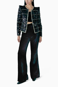 Featuring embellished black sequins jacket set with pearl and stone work lace with illusion shoulders paired with pants and asymmetric tube top