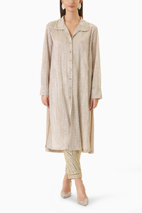 Textured longline shirt in a mesmerizing shimmering lamé fabric that drapes elegantly in a relaxed silhouette. Delicately designed with sophisticated waist-high slits on the sides. The shirt has a metallic button closure from the front neck till the waist and is worn open below. The sleeve has metallic buttons on the cuff. The shirt is worn over structured high-waisted pants with placed gota ribbon embroidery all over. Geometric patterned manual embroidery on recycled tulle, the pants are lined with a contrasting chocolate brown fabric to add a touch of elegance. Secure hook-and-zip closure at the front and pockets in the side.