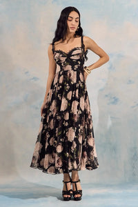 This structured corset-style dress features a scalloped lace-trimmed sweetheart neckline and adjustable straps. The fitted bodice flows into an A-line, calf-length silhouette, while a smocked back ensures comfort and fit. A romantic blend of structure and softness.