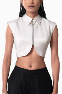The Shiro Cropped Shirt is a bold, fitted design that features exaggerated shoulders, creating a striking silhouette. A metal ring at the collar adds an edgy, modern touch, making this shirt a statement piece that effortlessly blends structure with style.