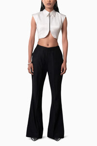 The Shiro Cropped Shirt paired with the Kuro Slit Trouser creates a bold, fashion-forward ensemble. The fitted Shiro Cropped Shirt features exaggerated shoulders and a striking metal ring at the collar, adding a sharp and modern edge. When paired with the Kuro Slit Trouser, which boasts flared legs and slits at the back, the look is sleek, stylish, and full of movement, making it the perfect combination for a standout outfit.