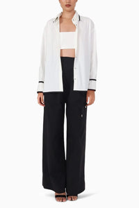 Shirt Michelle with piping is a chic, statement-making piece designed to elevate any wardrobe. Crafted from premium cotton, this versatile shirt looks effortlessly cool whether worn buttoned up or open, thanks to its innovative inner panel. Its relaxed silhouette features dropped shoulders, a generously curved hem, and a classic collar enhanced with eye-catching piping details that add depth and flair. Perfect for expressing personal style with confidence and grace. Shirt Michael is ideal for creating polished, effortless looks. Pair it with Pant Saucy for a refined yet laid-back ensemble, exuding undeniable style and elegance.