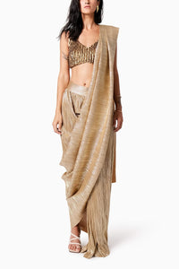 Composition- Silk and Pleated Metallic Colour- Gold Fit- This sari fits true to size, takes the shape of your body as it is a drape. The sari is high waisted, get it according to your high waist size. The blouse is cut for a slim fit. Customization - There will be an additional 10% charge Size Guide- Measurements in the size guide are ready garment measurements Components- Product code - SVE4318SVE43182220205&1201603