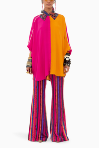 Featuring Shocking Pink Beyond Ken Mandala Shirt with Drape Trousers. Aseem Kapoor's Italian Crepe shirt in a striking Shocking Pink color block design boasts a detailed collar adorned with beadwork. Paired flawlessly with Bootleg Trousers in Italian Crepe and Slub Satin, this Beyond Ken ensemble redefines elegance with its anti-fit silhouette.