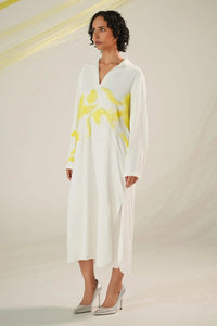 Featuring a white dress adorned with ombré Monet PVC embroidery across the front, back, and sleeves, this piece is designed with an open collar neckline and relaxed long sleeves. The midi length adds a refined, easy elegance.