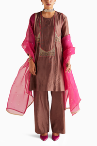 Fabric- Kurta and Pant- Chanderi Silk, Dupatta- Organza Silk Color- Brown Embroidery- Zardozi Fit- Relaxed Components- 3 Product Code- SVEESHAEA1202