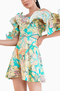 Featuring the Short Jumpsuit with Corsage Detail and Waist Cutout by Mandira Wirk's Waves of Love Collection. This stylish printed jumpsuit in beige and mint green cotton poplin features a charming corsage detail and a flattering waist cutout, perfect for a chic and comfortable look at any event.