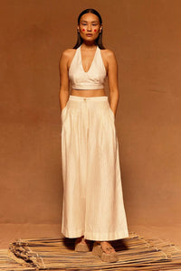 The Shunkan Pleated Pant combines laid-back,boyfriend-style ease with refined tailoring. Craftedfrom printed Chanderi, these pants feature front andback pleats, a wide-leg silhouette, and practicalpockets, offering both comfort and style. The flatteringfit and effortless design seamlessly balances relaxationwith sophistication for any occasion.