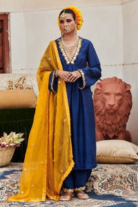 Blue Raw Silk sharara set with mirror work on neckline and sleeves of tunic and matching pants paired with a contrasting yellow organza dupatta.