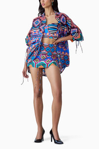 Featuring Sia Ikat Batwing Shirt, Bustier Blouse & Skort Set by Saaksha & Kinni's Hana Collection, this set includes an Ikat-inspired batwing shirt with sleeve and waist tie-ups, a bustier blouse with adjustable straps, and a coordinating skort. Made from cotton and satin in blue and multi hues for a chic, versatile look.