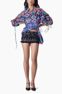 Featuring Sia Ikat Batwing Tie Shirt by Saaksha & Kinni, this stylish shirt features an Ikat-inspired print with a collared batwing sleeve design. The shirt is enhanced with sleeve and side tie-ups for a chic, adjustable fit. Perfect for a contemporary, bold look.