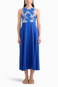 Featuring the Sia Midi Dress by House Of Exotique boasts a timeless A-line fit with a round neck and floral lace appliqué, having pockets and a back zipper, it's crafted from cotton satin, twill, and lace in a captivating blue hue.