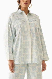 Siam set in Flora print, a shirt with extended tapered sleeves, caterpillar detail on the shoulder and angular patch pockets. The shirt boasts contrast top stitch details and a visible sleeve placket.
