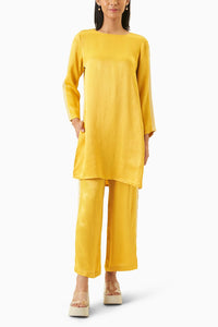 Sunflower yellow popover longline top in soft rayon fabric. Round neck top with a play of two different embroideries along the shoulder, sleeves and side seams. High/low hem detail on the sides. Keyhole and button closure at the back. Paired with matching straight pants with placed embroidery down the side seams. Elasticated at the waist, pockets on the side.