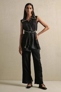 The Side Fun co-ord set from Mo by Meet is a striking combination of luxury and artistry, crafted from rich black satin silk. The top is adorned with intricate golden and off-white patchwork and embroidery along the collar and side panel, adding a refined, artistic touch. A chic cut-out panel on the upper adds a contemporary flair, while a matching belt is included for versatile styling options. The set’s elegant detailing and sophisticated design make it the perfect choice for those seeking a standout look that blends modernity with timeless elegance.