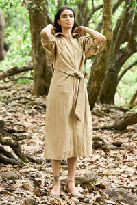 Featuring a light khaki hue, this midi dress is styled with a V-neck shirt collar and relaxed dolman sleeves finished with marble and gold inset button cuffs. A side tie knot enhances the silhouette, while a short slit adds ease and movement for everyday elegance.