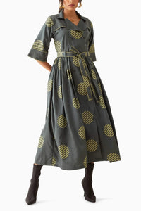 Sienna dress with Spot print, tailored from cotton poplin, featuring Wide sleeves with contrast piping and stitches running across the cuff. It boasts a double-breasted silhouette with a lapel collar and sleek black metal buttons, imitating a trench inspired dress.With its flattering fit and stylish design, this dress is perfect for making a statement at any occasion.