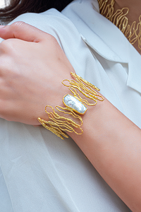 Material- Handcrafted from hypoallergenic brass, embellished with Biwa pearl, and plated in 14 kt gold.