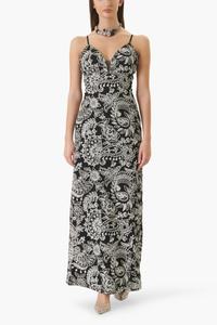 Statement column gown with all-over contrast white sequin embroidery in our signature pattern, on a black viscose base. Halter scoop neckline and adjustable straps on the shoulders, removable pad pockets. Sophisticated knee-high slit and concealed zip closure at the back. The garment is fully lined with recycled knitted lining.