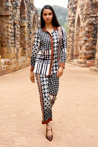 This sophisticated set features a houndstooth and geometric blocked print in elegant tones of black, white, cream, and brown. Crafted from breathable, textured organic viscose, the concealed placket shirt with full sleeves offers a polished look with a relaxed fit. It’s paired with matching straight pants, designed with a semi-elasticated waist and convenient side pockets for added comfort and style. (Scarf not included.)