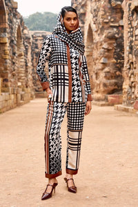 This stylish set features a houndstooth and geometric blocked print in sophisticated tones of black, white, cream, and brown, crafted from breathable, textured organic viscose. The concealed placket shirt with full sleeves offers a relaxed fit for effortless elegance. Paired with matching straight pants featuring a semi-elasticated waist and side pockets, the ensemble is completed with a coordinating printed scarf for a chic, cohesive look.