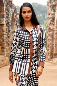 This stylish shirt features a striking houndstooth and geometric blocked print in a sophisticated mix of black, white, cream, and brown. Crafted from breathable, textured organic viscose, it offers both comfort and style. The concealed placket and full sleeves add a polished touch, while the relaxed fit ensures effortless wear.