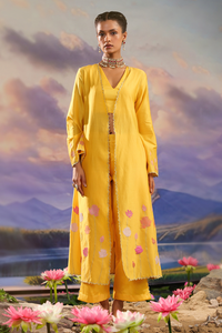 Elevate your wardrobe with our exquisite Silk Chanderi Jacket Co-ord Set, a testament to timeless elegance and contemporary flair. The set includes a beautifully tailored jacket, adorned with intricate motifs or delicate embroidery, showcasing impeccable craftsmanship and traditional artistry. Paired with a coordinating inner and pants, both lined for comfort and elegance, this ensemble offers versatility and grace.