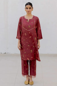 A handblock-printed relaxed-fit Slate Color Co-ord Set in handwoven chanderi, featuring exquisite sequin, resham, and zari hand embroidery on the kurta placket. Crafted using natural-dyed hand block prints, the set is paired with cotton trousers, also detailed with hand block prints in natural dyes, creating a chic and coordinated look.