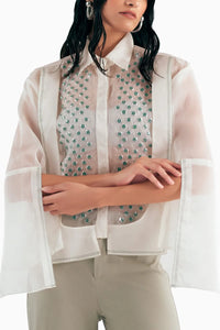 The Silk Organza Bubble Wrap Panelled Shirt, crafted from luxurious silk organza in off-white, features unique bubble wrap panel detailing. This elegant, contemporary piece combines texture and flow, offering a sophisticated and chic look that elevates any wardrobe with modern refinement.