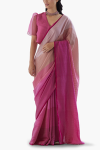 Created with meticulous care, our Silken Memoirs saree features a harmonious blend of gradating pink shades in a captivating striped pattern. Crafted from the finest organza silk satin, this soft silk saree embodies heritage and comfort in equal measure. It can be worn in two distinct ways, offering you the freedom to adapt your look to different occasions. Wear it from dark to light to exude sophistication and subtlety, or reverse it from light to dark for a bolder, more dramatic statement.