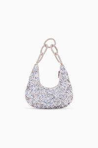 Featuring Silver Abraxas Handbag by 5 Elements by Radhika Gupta. Elevate your style with sophistication and glamour. Adorned with intricate stone sequence embroidery, this chic accessory makes a bold statement. Impeccably crafted with leatherette and a detachable crossbody chain, it's a perfect blend of timeless elegance and contemporary fashion.