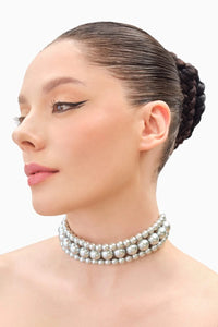 The Alternate Silver Pearl Choker features a sleek, contemporary design with alternating silver-toned pearls and metallic accents, creating a chic, modern look. The lustrous silver pearls are spaced evenly to form a striking pattern, offering a refined, elegant touch to any outfit. This versatile piece can easily transition from day to night, making it perfect for both casual and formal occasions.