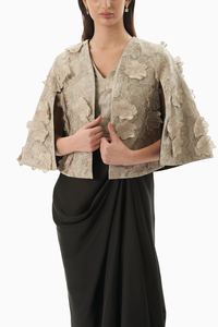 Featuring the Silver and Black Antique Floral Cape by Renasci from the Untamed Collection. Crafted in Applique Tissue, this Antifit Cape in stunning silver and black exudes timeless elegance effortlessly.