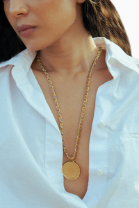 Add celestial charm to your look with the Celeste Neckpiece. Crafted from gold-plated brass with sun and moon embossed motifs, this neckpiece features an interlaced chain and is reversible. Transform your look in an instant and add a touch of starlight glamour.