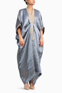 An effortless ode to tradition. This silver Chanderi kaftan captures the grace of a classic silhouette with otouto’s modern restraint. Featuring a cascading front and a V-neckline with hook fastening, the piece moves fluidly while retaining a sculpted presence. Intricate geometric embroidery adorns the neckline and sleeves — inspired by the tribal artistry of the Rabari community — rendered in luminous gold thread. A hand-embroidered gold leaf motif anchors the look on the rich Chanderi fabric, complemented by a soft inner liner for comfort. An elegant fusion of cultural craft and contemporary form — timeless, fluid, and quietly opulent. 58 inches long.