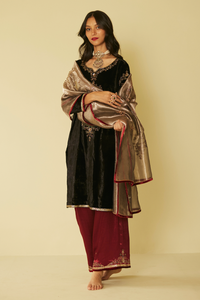 Featuring Silver Dareecha Tissue Dupatta by Sarang Kaur by Meera Collection. Crafted by delicate tissue silk, this dupatta in shimmering silver adds a touch of elegance to any attire. Perfect for formal occasions, it enhances your style with its luxurious drape and subtle sheen.