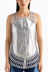 Featuring the Silver Foil Sunray Shirt by MellowDrama's by Utopia Collection. Made from 100% cotton, this sleeveless shirt includes a front opening with buttons and features a handmade sunray weave panel at the front. It offers a regular fit, combining casual comfort with a touch of artisanal elegance.