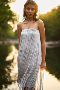 Featuring a silver knit tube silhouette, this striking dress is elevated with cascading silver fringe flowing from the neckline, creating eye-catching movement. Designed with a high-shine metallic finish, it includes a concealed back zip with hook-and-eye closure and comes with adjustable, detachable straps for versatile wear.