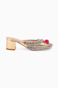 Featuring Gold Ghungroo Crown Heels by 5 Elements by Radhika Gupta. Elevate your style with these beautifully handcrafted heels. The glossy gold base adorned with palmette-like motifs and embellished with gotapatti work exudes elegance. Bunches of silver ghungaroo add a fuller look. Perfect for pairing with embroidered lehengas or sarees for a festive look!