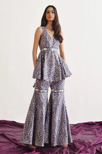 Introducing the Silver Grey Peplum Top with Scallops from the Rangrez collection by 29 India. Designed in a stunning Silver Grey hue, this elegant top features intricate Mirrorwork embroidery, meticulously crafted on luxurious Tissue fabric. The tailored fit, combined with delicate scalloped detailing, adds a touch of grace and sophistication to this contemporary silhouette.
