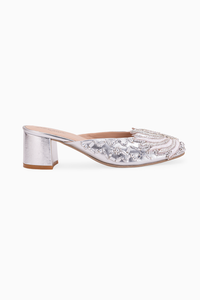 Featuring Silver Lotus Mule Heels by 5 Elements by Radhika Gupta. This pair embodies purity and elegance for your wedding day. With a glossy silver base and intricate lotus motif in dabka, kasab, nakshi, and pearl work, they're a symbol of beauty and blessings, making them perfect for your special day.
