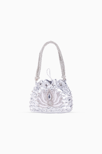 Featuring Silver Lotus Potli by 5 Elements by Radhika Gupta. Handcrafted with intricate hand embroidery, pearls, and Goota, adorned with Lotus and ghungroo embellishments. Perfect for mehndi ceremonies and weddings, it adds elegance to any ensemble.